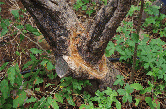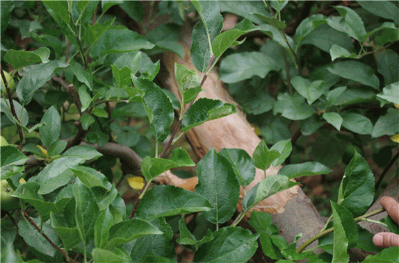 上圖為腐爛病導致這棵蘋(píng)果樹(shù)皮被刮掉大面積