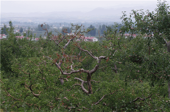 上圖為得了腐爛病的蘋(píng)果樹(shù)整株死亡